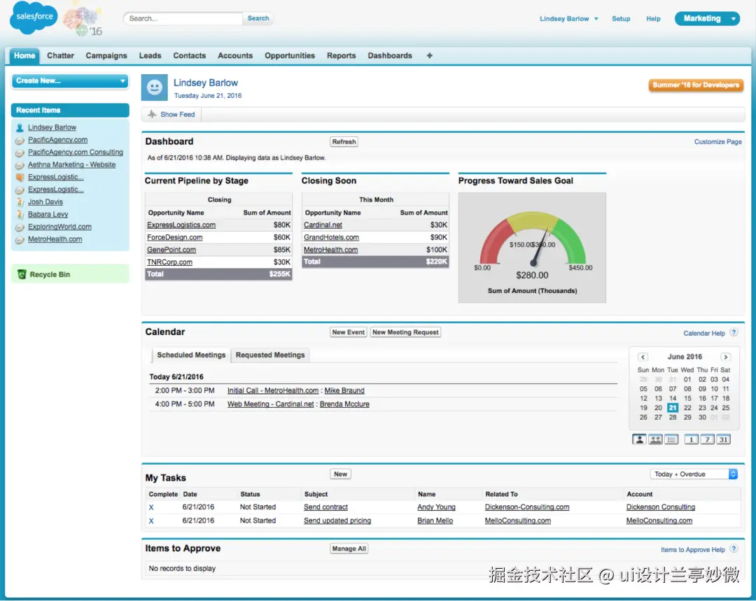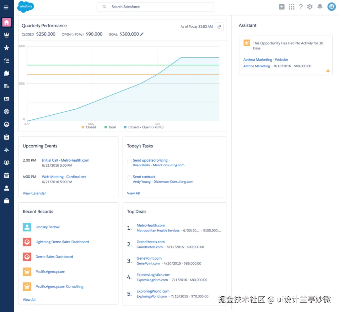 同样非常老牌的 Salesforce 在2015年的时候。也带来了相当大的视觉变化。整体都能感受到,整个页面会通过不断的分层颜色的划分通过黑白灰的方式去呈现页面当中的基本信息。