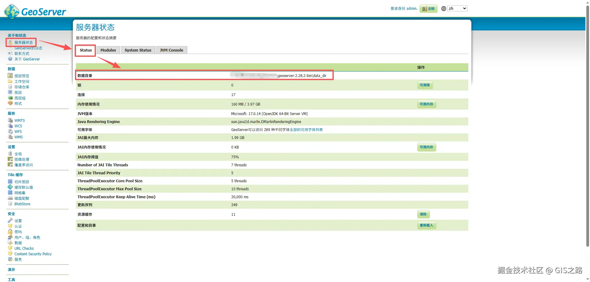 不用着急,可以运行GeoServer程序,打开管理界面,在左侧菜单栏点击【服务器状态】,在【状态】面板中便可看到数据目录位置。