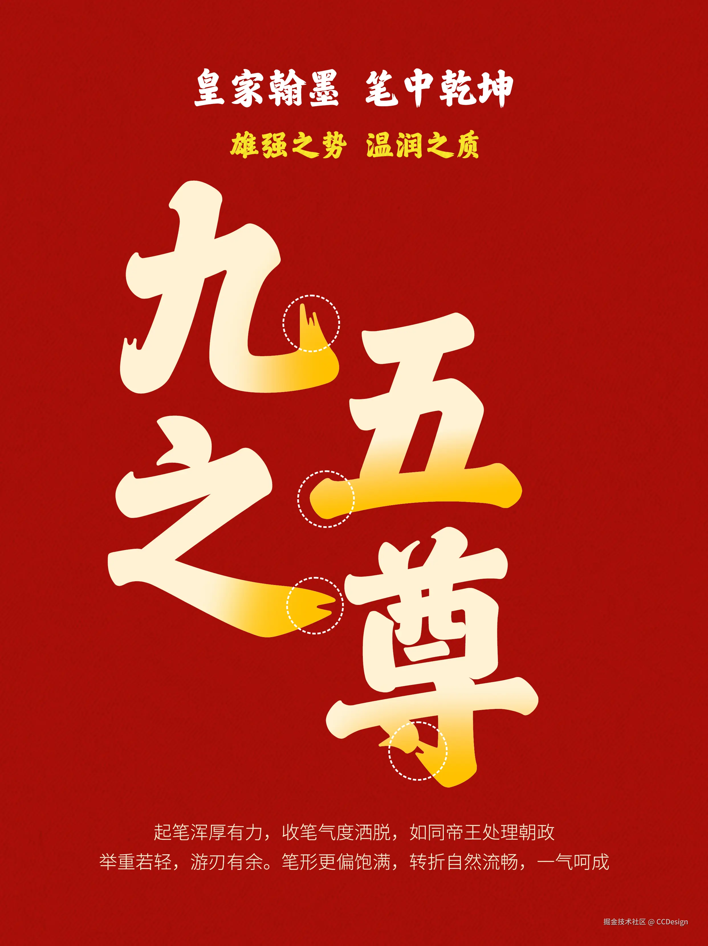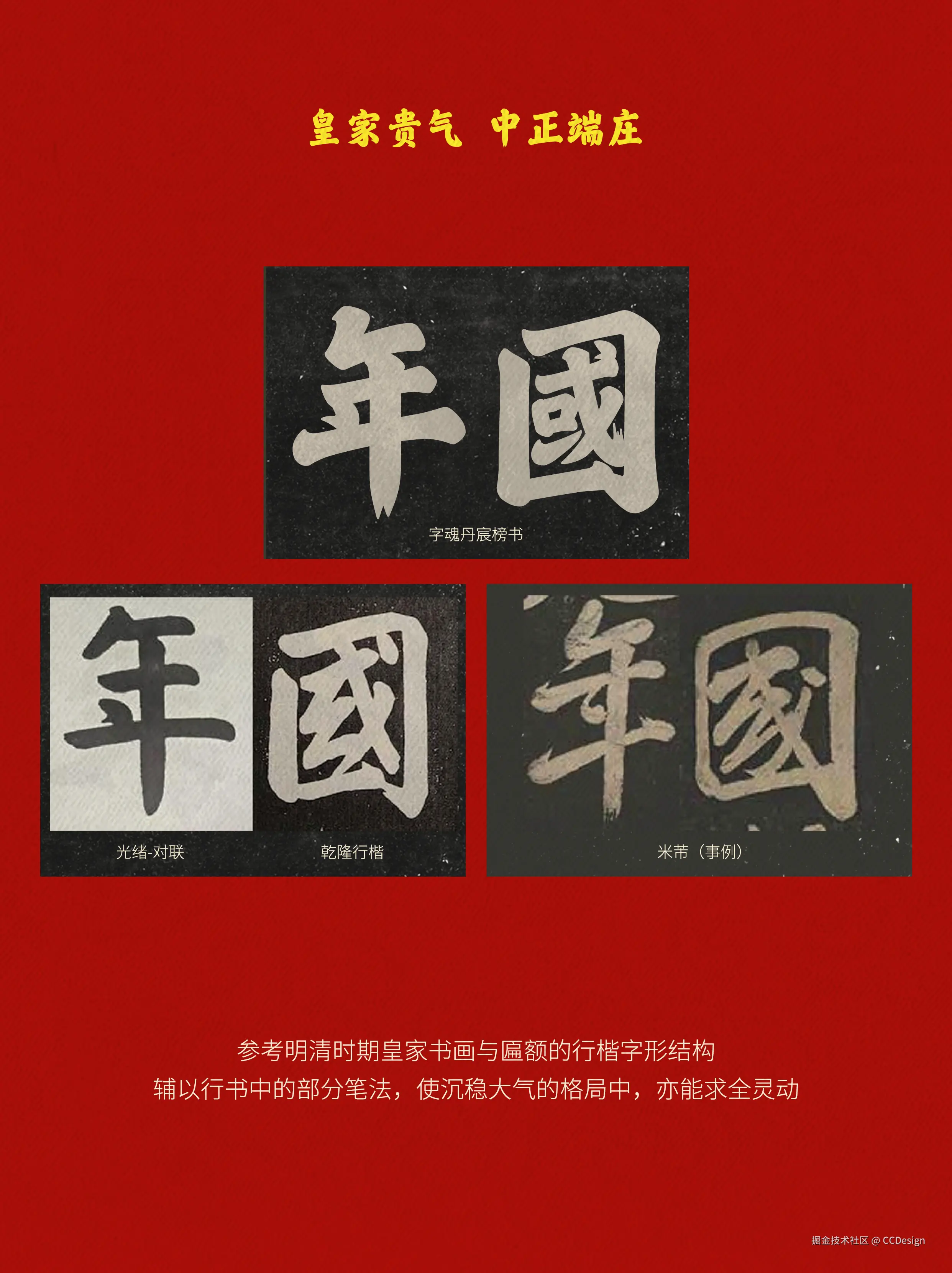 「**字魂丹宸榜书」**以皇家贵气为内核,呈现中正端庄之姿,设计团队深度参考明清时期皇家书画与宫殿匾额的行楷字形结构,巧妙融入行书笔法,让沉稳大气的整体格局之中更添灵动气韵;同时兼具雄强之势与温润之质,起笔浑厚有力,收笔洒脱大气,笔形饱满圆润,转折自然流畅,整体一气呵成。