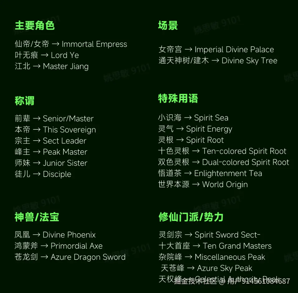 古风/仙侠类专属词汇:修炼、渡劫、天道、因果……这类词汇在英语里没有对应概念,需要建立统一的翻译规范(同一个词在整部剧里必须用同一个英语表达)。