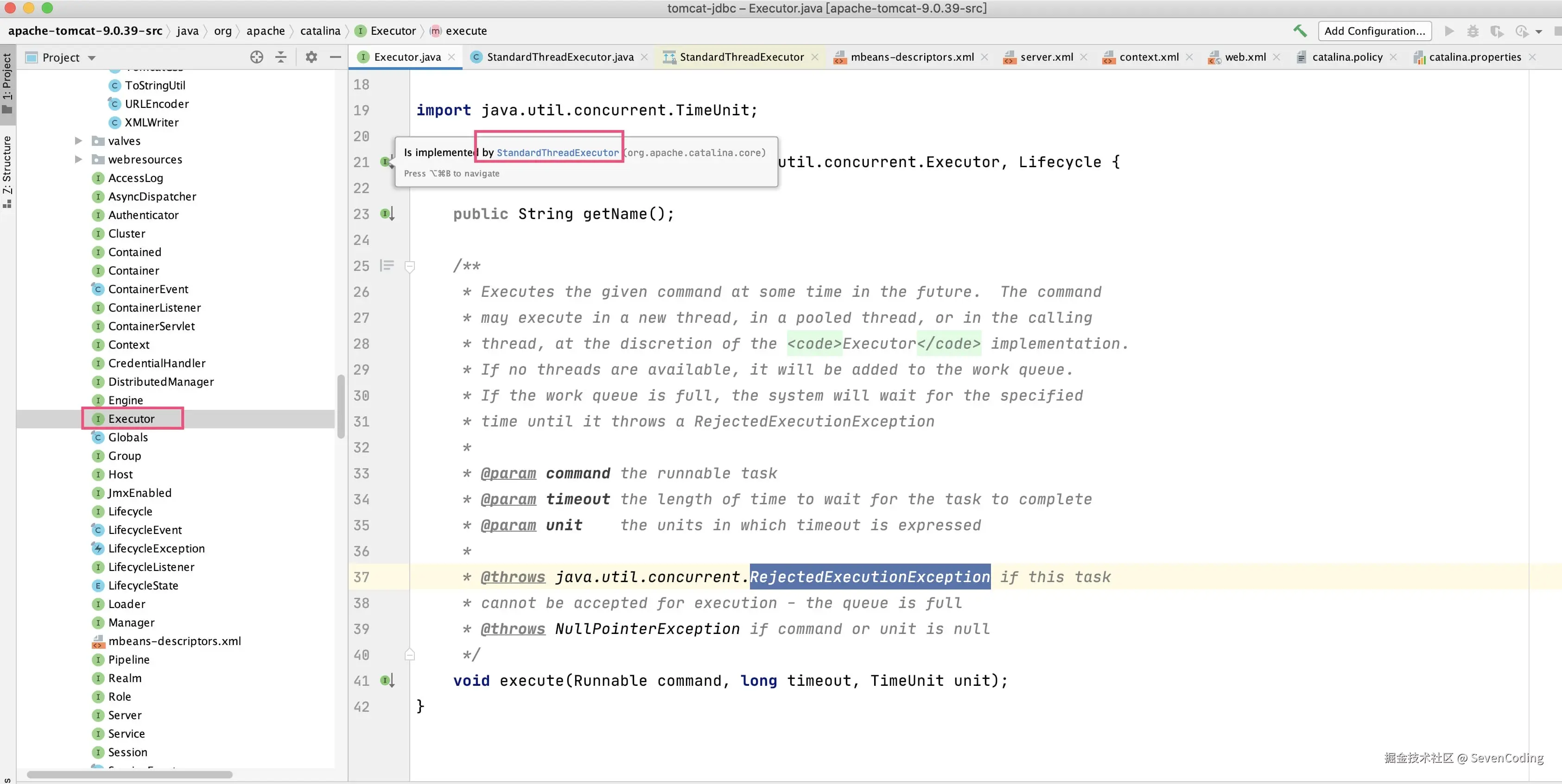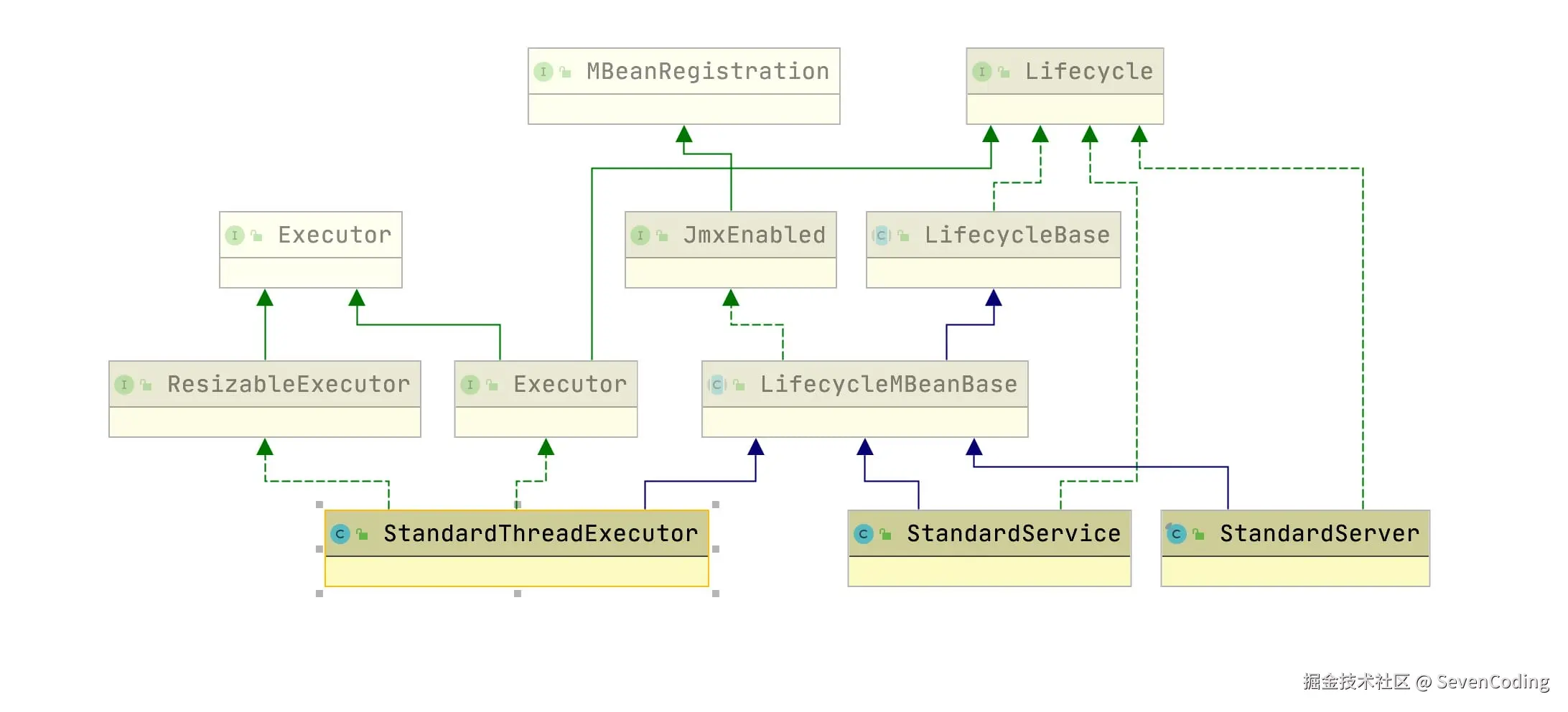 - 和Server、Service实现一样,StandardThreadExecutor也是继承LifecycleMBeanBase;然后实现Executor的接口。