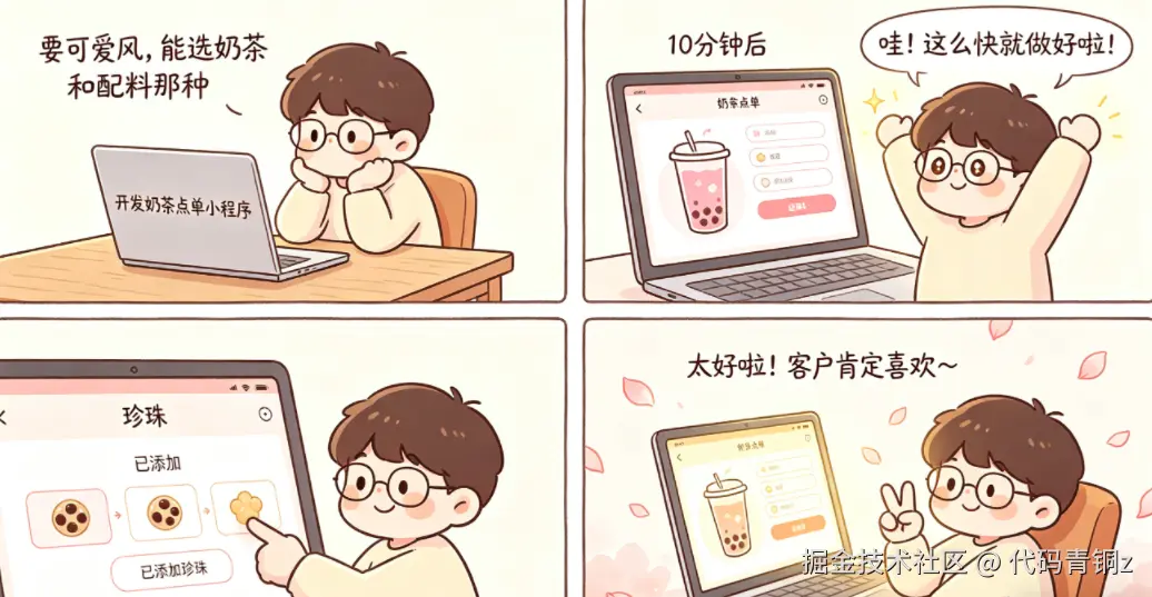 你跟 AI 说一句 “我要做个奶茶点单小程序,要好看的界面,能选糖度冰度,能微信付款”,它 10 分钟就能给你做出一个像模像样的页面,点进去能选商品,能跳付款界面,看着和外面正经的点单程序没两样。