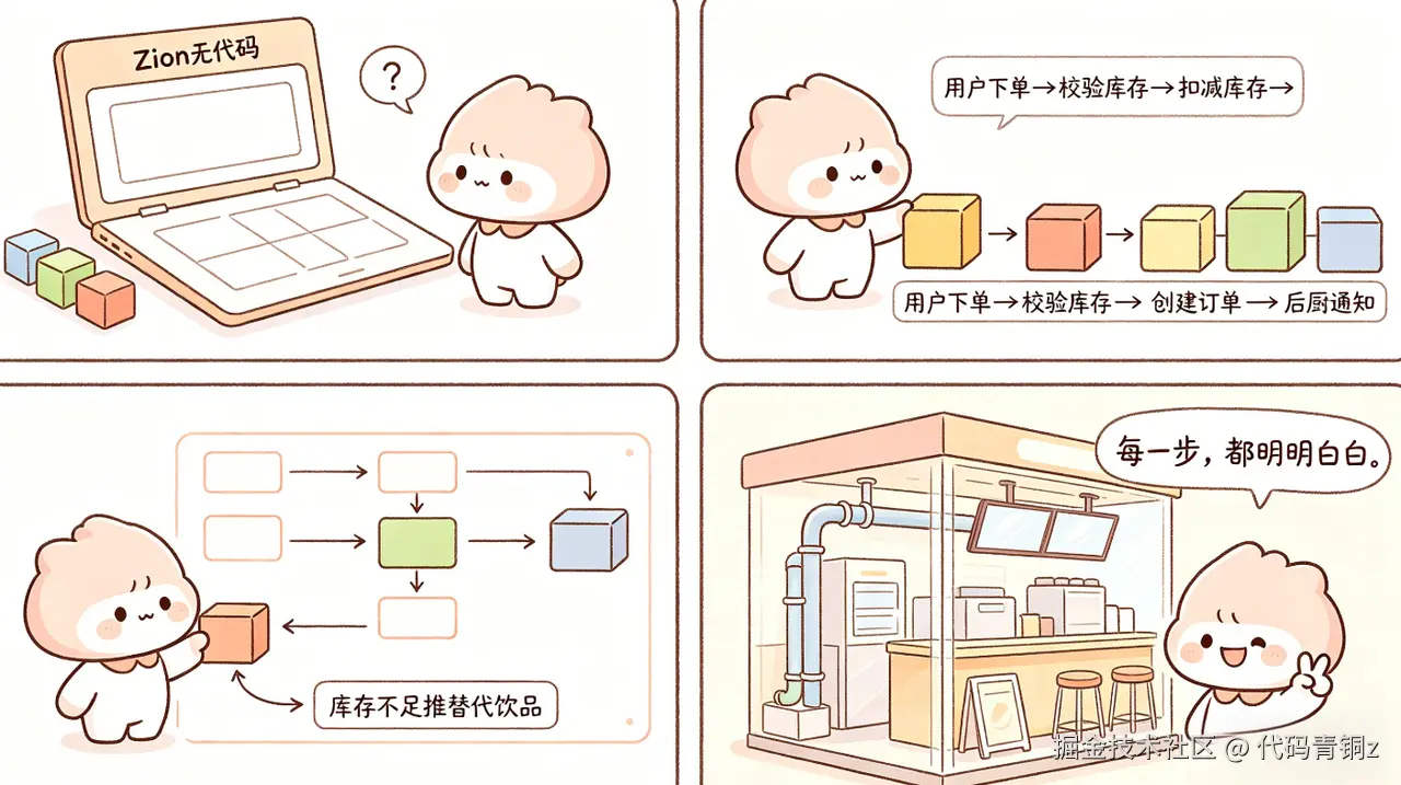 还是拿奶茶店的「用户下单」流程举例子。用 AI 编程,你得到的是一堆藏在各个角落的代码,下单规则、库存校验、订单创建的逻辑,全部分散在你看不懂的文件里,想加个 “库存不足时给用户推替代饮品” 的规则,你得翻遍所有代码,还要怕改了这里,别的地方又出问题。