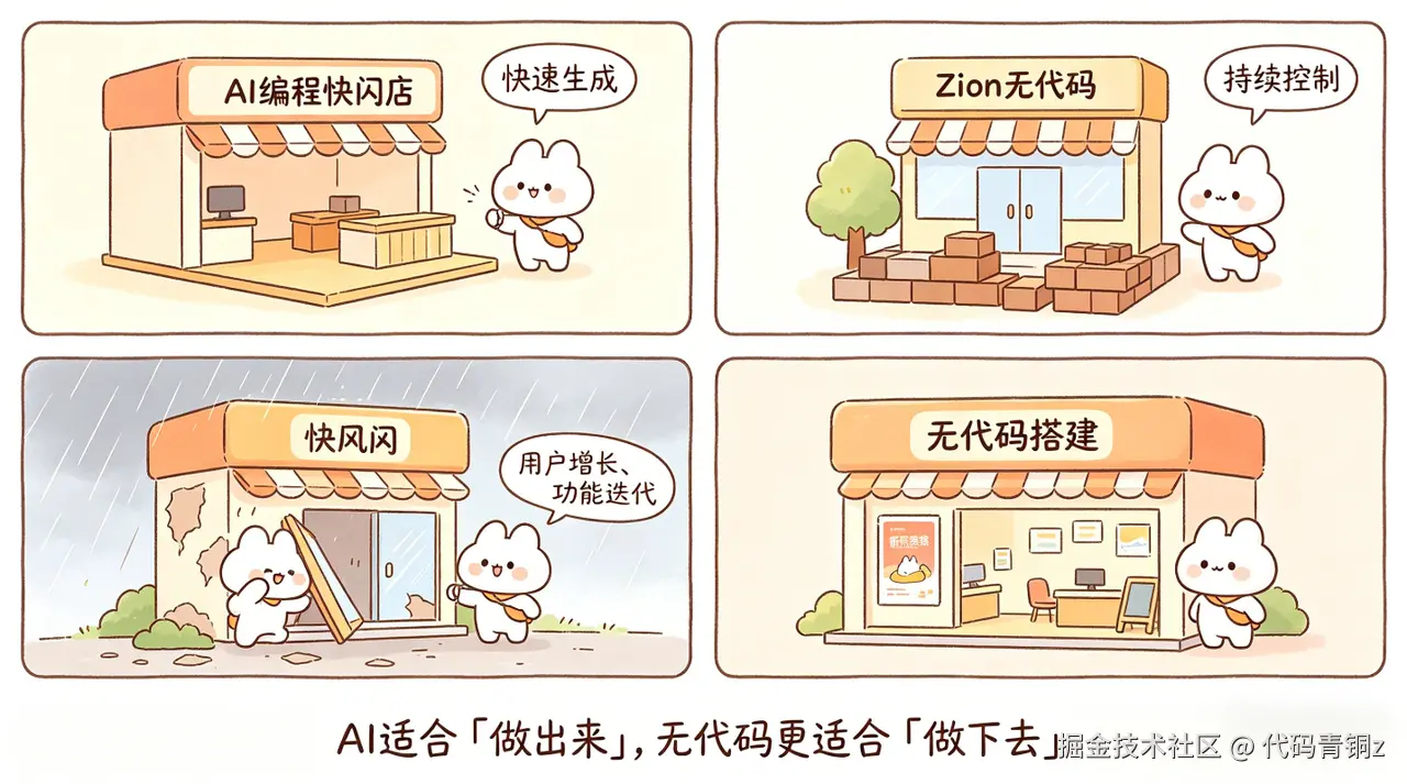 一句话说透:只靠 AI 一键生成,撑不起创业项目。选工具别只看生成速度,要选能让你真正当产品的家、陪生意一直走下去的 Zion 无代码。