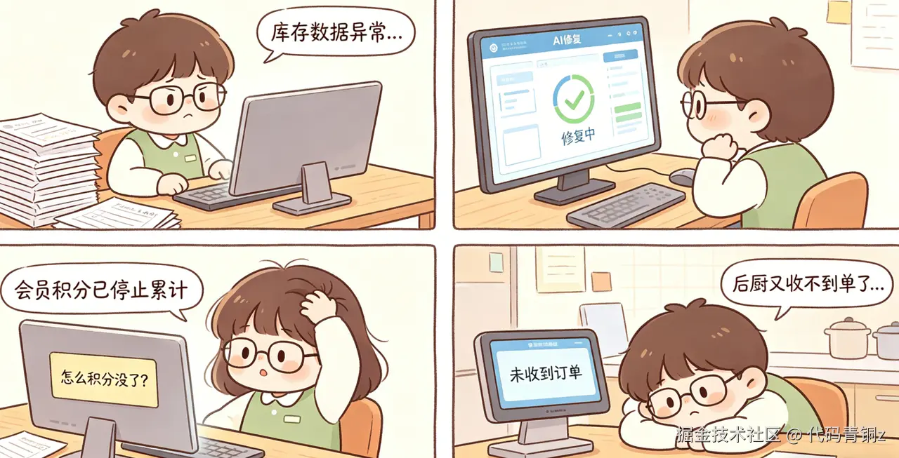但问题,往往从你真的要 “用它做生意” 开始,就全来了。你开业了,想加个 “第二杯半价” 的活动,AI 帮你改完,结果库存扣错了,明明卖了 2 杯,只扣了 1 杯的原料;你让它修库存的问题,改完之后,会员积分又不累计了;你再让它修积分,结果付款之后后厨收不到订单了;改来改去,你陷入了 “修一个 bug,多出两个新 bug” 的死循环,最后发现整个系统乱成一团,你完全不知道哪里出了问题,更不知道怎么解决。