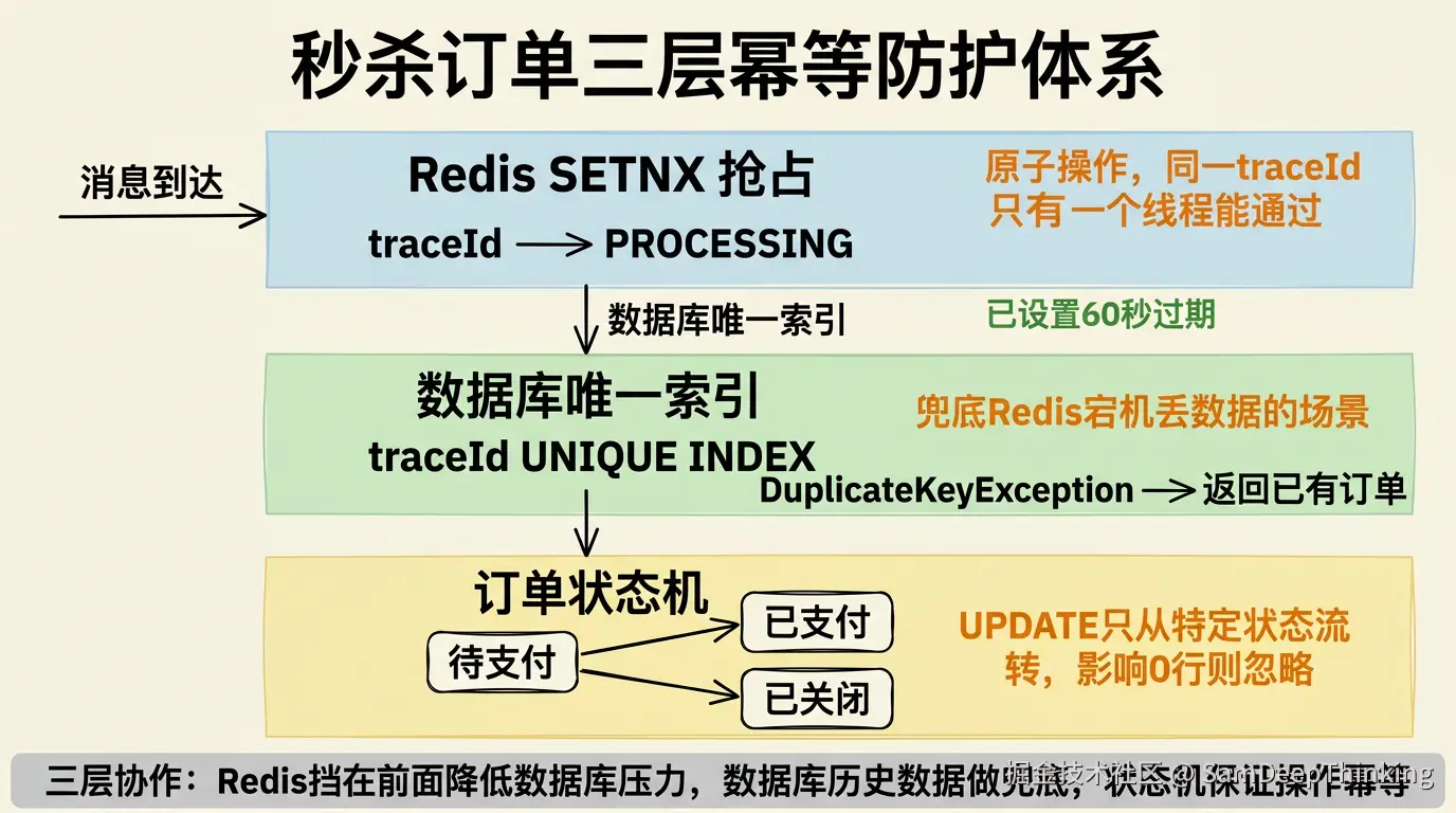 第二层是数据库的唯一索引。在订单表的traceId字段上建唯一索引,即使Redis层漏过了重复请求,数据库的DuplicateKeyException也会阻止重复插入。消费端捕获这个异常后,不当错误处理,而是查询已有订单返回给前端。