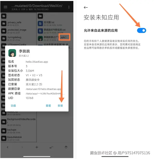 安装时需要授予“允许来自此来源的应用”,如图所示: