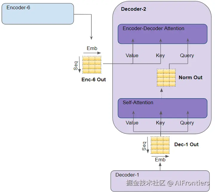 - 在解码器的编码器-解码器注意力中:编码器堆栈最后一个编码器的输出,被传给 Value 和 Key 参数;而它下面那个自注意力(和层归一化)模块的输出,被传给 Query 参数。
