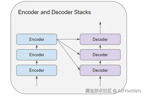 编码器堆栈和解码器堆栈,分别由若干个(通常是 6 个)编码器和解码器依次串联而成。