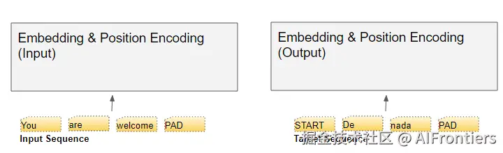 目标序列则被喂给第二个嵌入层,不过在喂之前,需要先把目标序列向右移动一个位置,并在第一个位置插入一个「起始」标记。