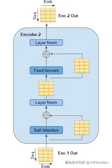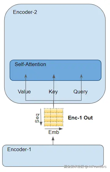 堆栈里的第一个编码器,接收来自嵌入层和位置编码层的输入。堆栈里的其他编码器,则接收上一个编码器的输出。
