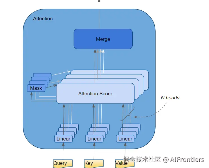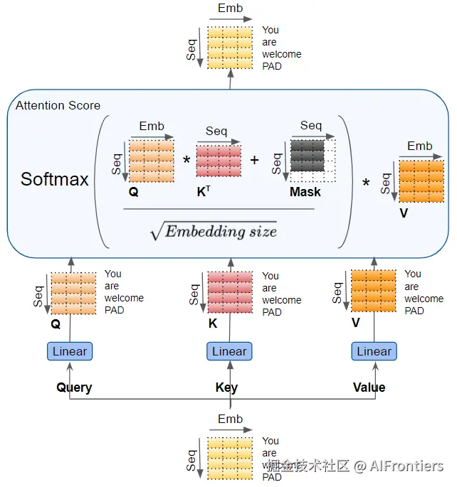 Query、Key 和 Value 会分别各自通过一个独立的线性层(每个层有自己的权重),产生三个结果:Q、K 和 V。然后,如下图所示,它们会通过注意力公式组合在一起,生成注意力分数。