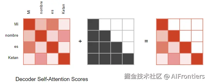刚才讨论解码器时,我们简单提到了掩码。上面的注意力图示里也画出了Mask。我们来看看它是怎么工作的。