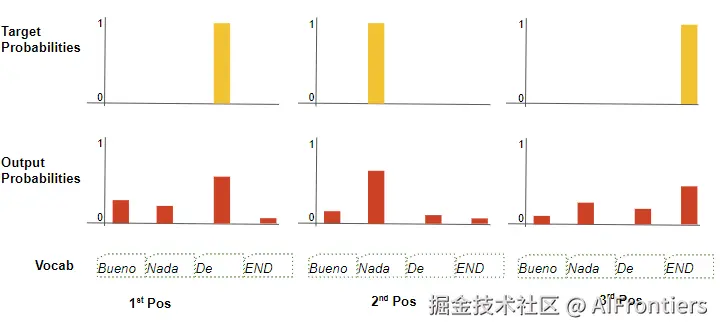 假设我们的目标词汇表只有四个词。我们的目标是产出一个概率分布,让它匹配我们期望的目标序列:"De nada END"。