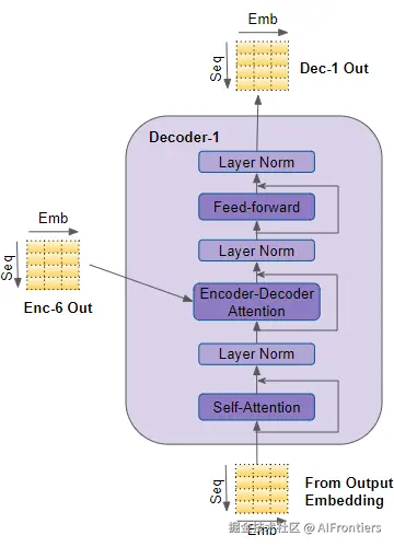这些子层:自注意力、编码器-解码器注意力和前馈层,周围都有一个残差连接,紧接着是一个层归一化。