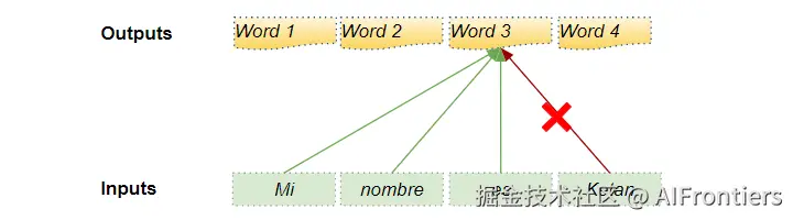 解码器处理源序列中的单词,并利用这些单词预测目标序列中的单词。在训练过程中,这一过程通过教师强制法实现,即将完整的目标序列作为解码器的输入。因此,在预测某个位置的单词时,解码器可以利用该单词之前和之后的目标单词。这使得解码器能够作弊,利用未来时间步的目标单词进行预测。
