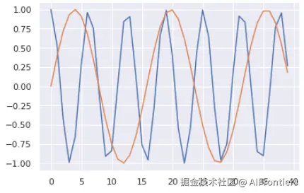 蓝色曲线展示了第 0 个索引对于全部 40 个单词位置的编码值;橙色曲线是第 1 个索引的。剩下的索引值也会有类似的曲线。