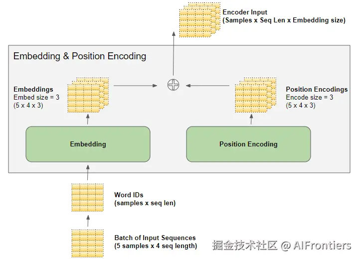 这个由嵌入层和位置编码层生成的 (样本数, 序列长度, 嵌入尺寸) 形状,会贯穿整个 Transformer:数据流过编码器堆栈和解码器堆栈时都保持不变,直到最后的输出层才会改变形状。