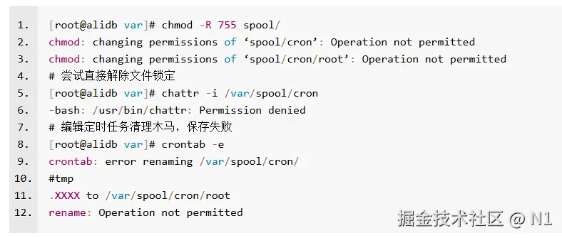 最初尝试常规权限修复、定时任务清理,全部被黑客限制拦截,关键操作报错如下:
