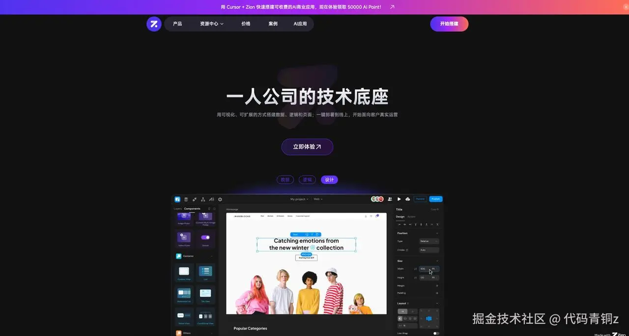 你不用会写代码,但你必须成为那个牢牢掌控业务方向盘的操盘手。而Zion 无代码,正是为非技术背景的创作者量身打造的那个 “搭积木沙盘”—— 它把 AI 原生能力与全可视化的无代码画布深度融合,通过 AI Copilot 让你用自然语言就能生成数据库表结构、业务行为流与页面组件,让 AI 生成的每一步逻辑都清清楚楚落在你能看懂、能上手修改的界面上。它完美适配 “生成→验证→修改” 的产品落地闭环,从前端页面、后端逻辑、数据库搭建,到 AI 能力集成、支付系统对接、多端一键部署,全程零代码可视化操作。不用啃一行代码,你就能把对生意的理解、对用户的洞察,一点点搭建进完整可商业化的产品闭环里 —— 这,才是 AI 时代,普通人做产品真正的护城河。