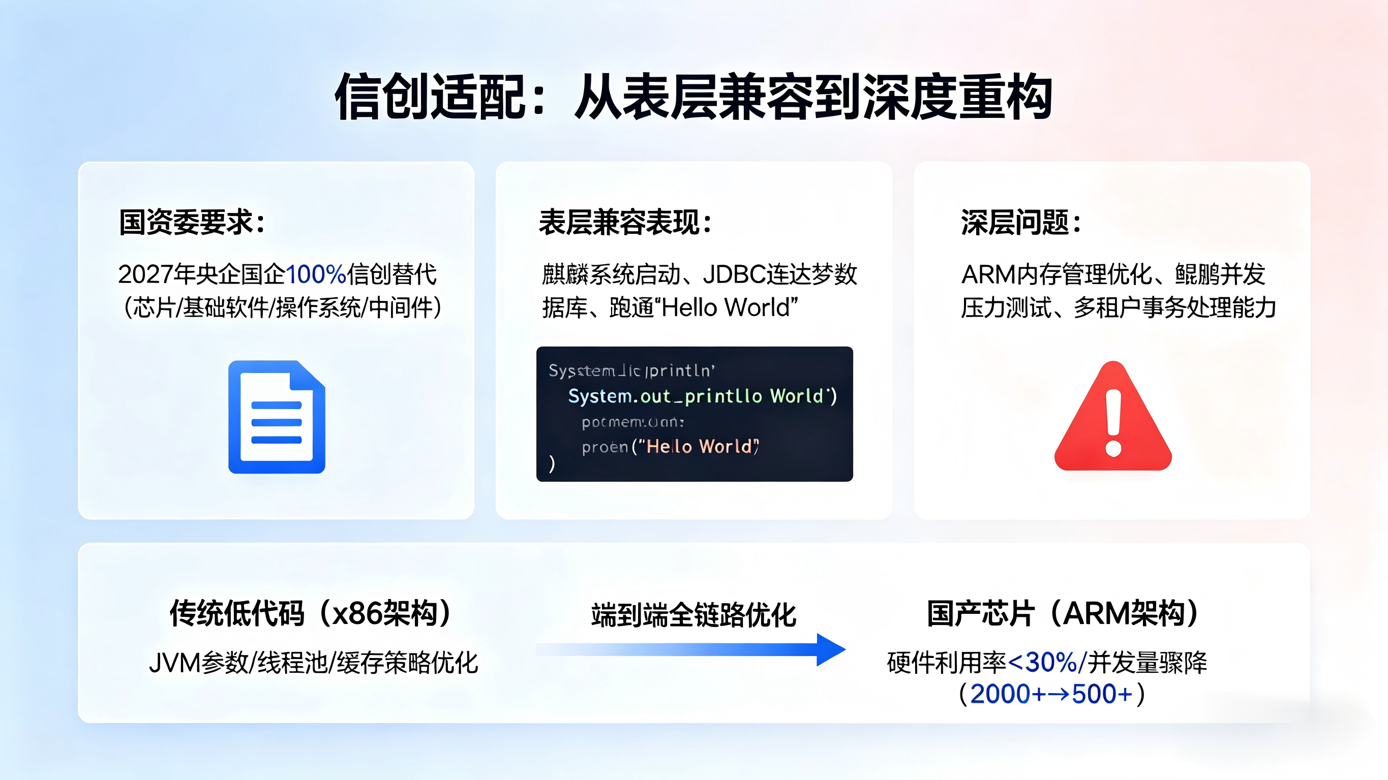 什么算表层兼容?平台能在麒麟操作系统上启动,能通过JDBC连到达梦数据库,跑一个“Hello World”不出错——就算适配成功。至于背后有没有针对ARM架构做内存管理的深度优化,有没有在鲲鹏芯片上跑过并发压力测试,有没有在多租户模式下实测国产数据库的事务处理能力,这些更深入的“坑”,往往要等到系统真正上线、业务真正跑起来之后,才会一一被挖出来。