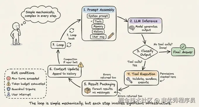从机械角度来看,这通常只是一个while循环。复杂性存在于循环所处理的方方面面,而非循环本身。Anthropic将他们的运行时描述为“一个愚蠢的循环”,其中所有智能都存在于模型中,而控制装置仅负责管理轮次。