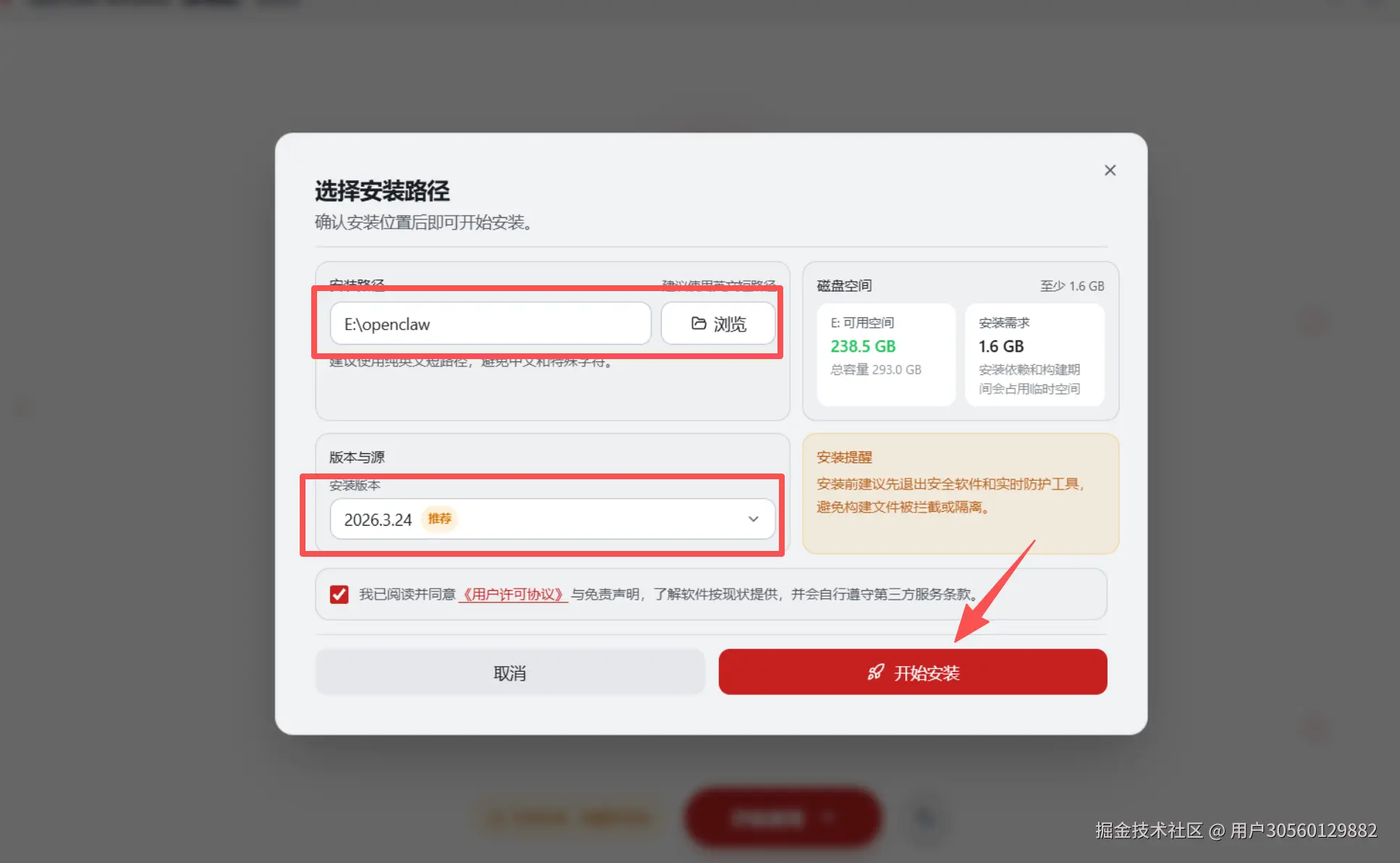 - 错误示例:D:\ 软件 \OpenClaw、D:\ 小龙虾、D:\Open Claw勾选同意协议后,点击「开始安装」。