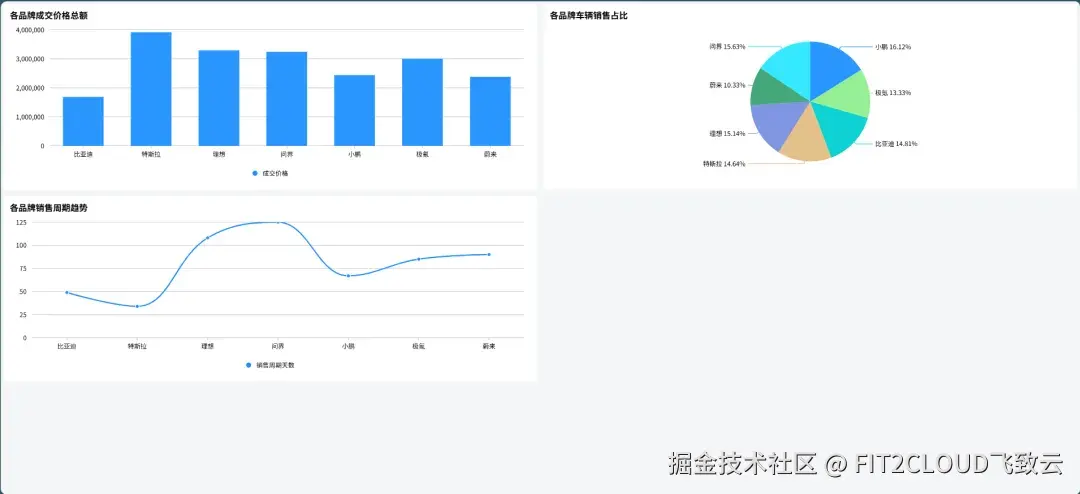 发出生成多图表组合大屏的指令(“帮我从多维度可视化分析下汽车销售数据情况”)的指令后,AI自动识别指标,选择适配图表并自动完成布局。