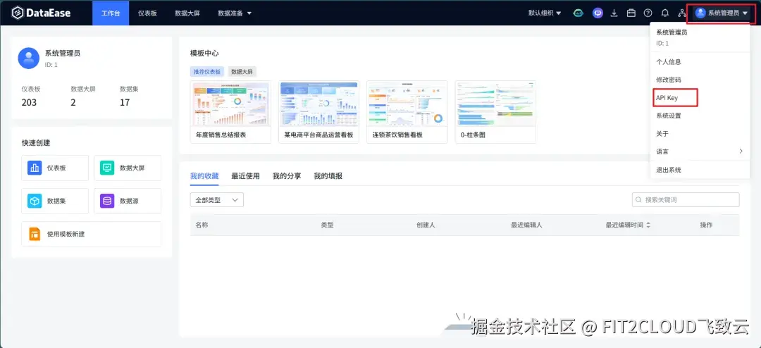 ① 登录DataEase,点击用户名,在打开的菜单中选择“API Key”选项,然后切换至“API Key”选项卡创建API Key;