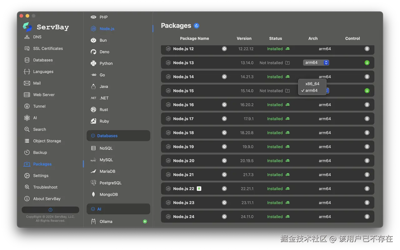 GPT-5.5 的许多高级功能(如 Codex 交互式工具)依赖于 Node.js 环境。例如,运行 npm i -g @openai/codex 是开启 GPT-5.5 终端智能体能力的前提。 ServBay 支持 Node.js 的多版本管理,开发者可以在 ServBay 的控制面板中秒级切换 Node.js 版本,以适配不同模型的 SDK 需求。这种“一键式”的环境准备,让开发者能将精力集中在 API 的逻辑调试上,而非环境报错的排查。