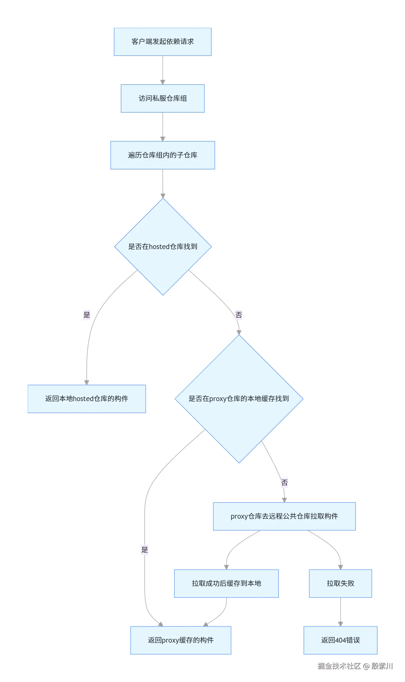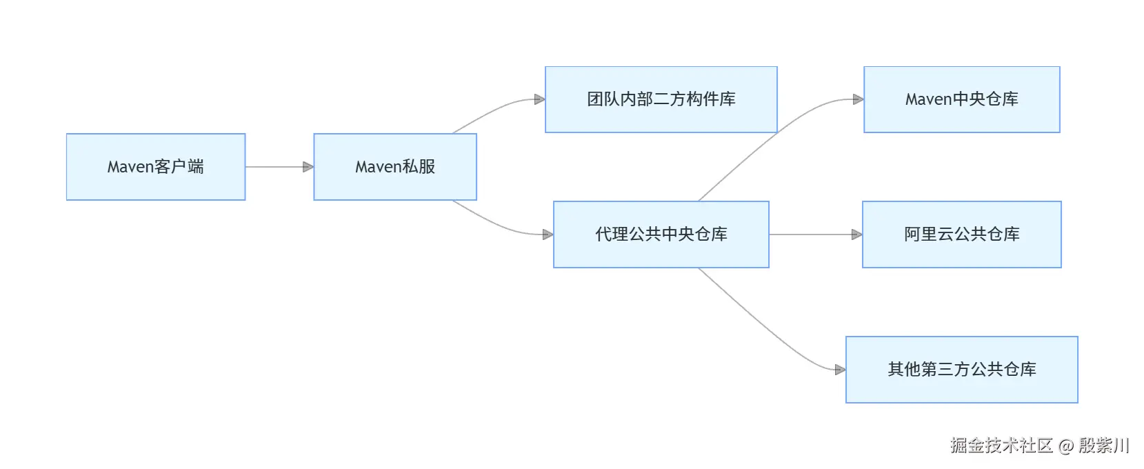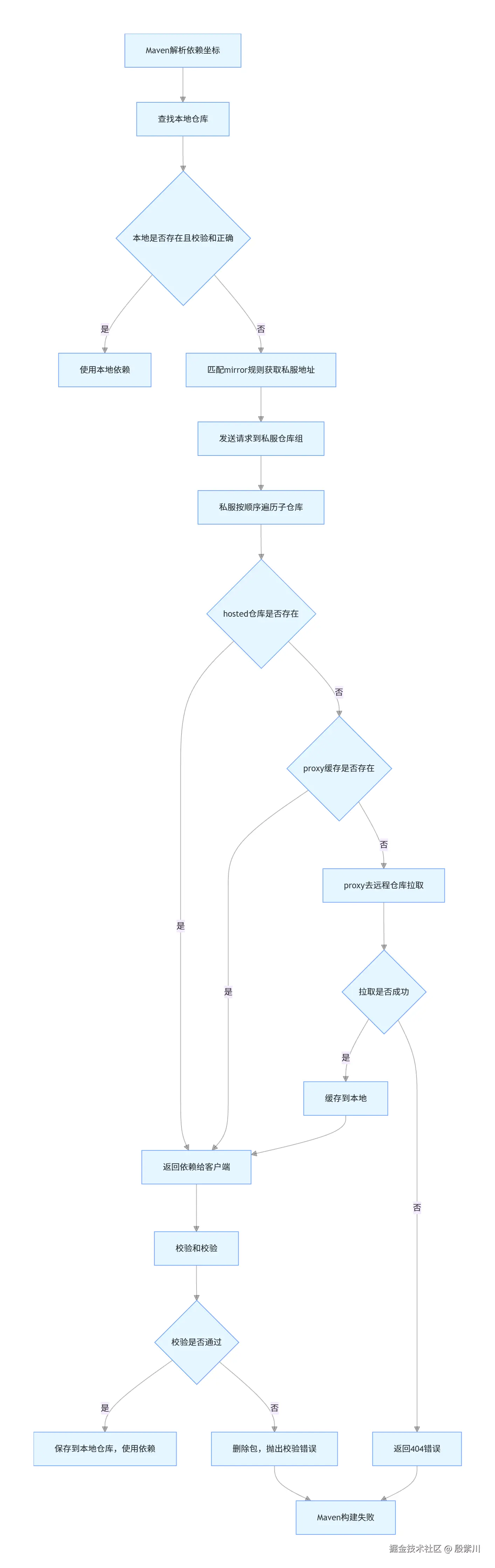 - 依赖下载加速与网络稳定性保障:私服会缓存所有从公共仓库拉取过的构件,团队内第二次请求同一个构件时,直接从私服本地返回,不用再走公网,彻底解决公网延迟、抖动、防火墙拦截的问题。缓存的不仅是构件本身,还包含元数据文件,实现全链路本地响应。