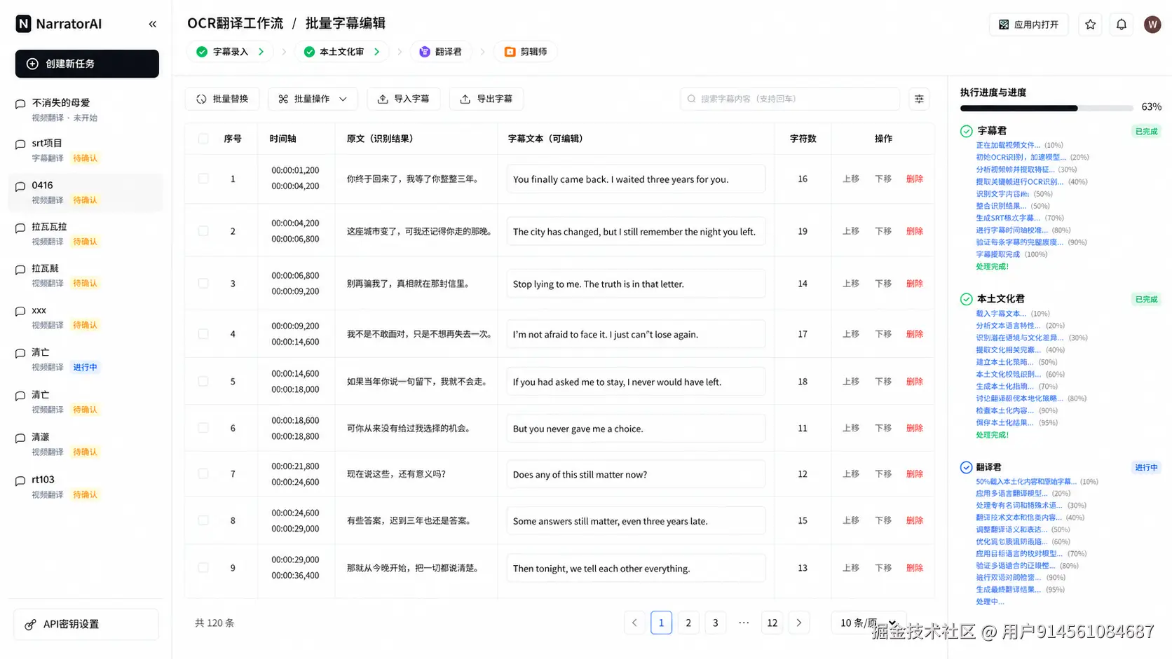 校对界面是一个在线编辑器,所有提取出来的字幕按时间轴排列,逐条显示。发现识别错误直接点击修改,支持批量操作。改完确认,任务才继续流转到翻译环节。