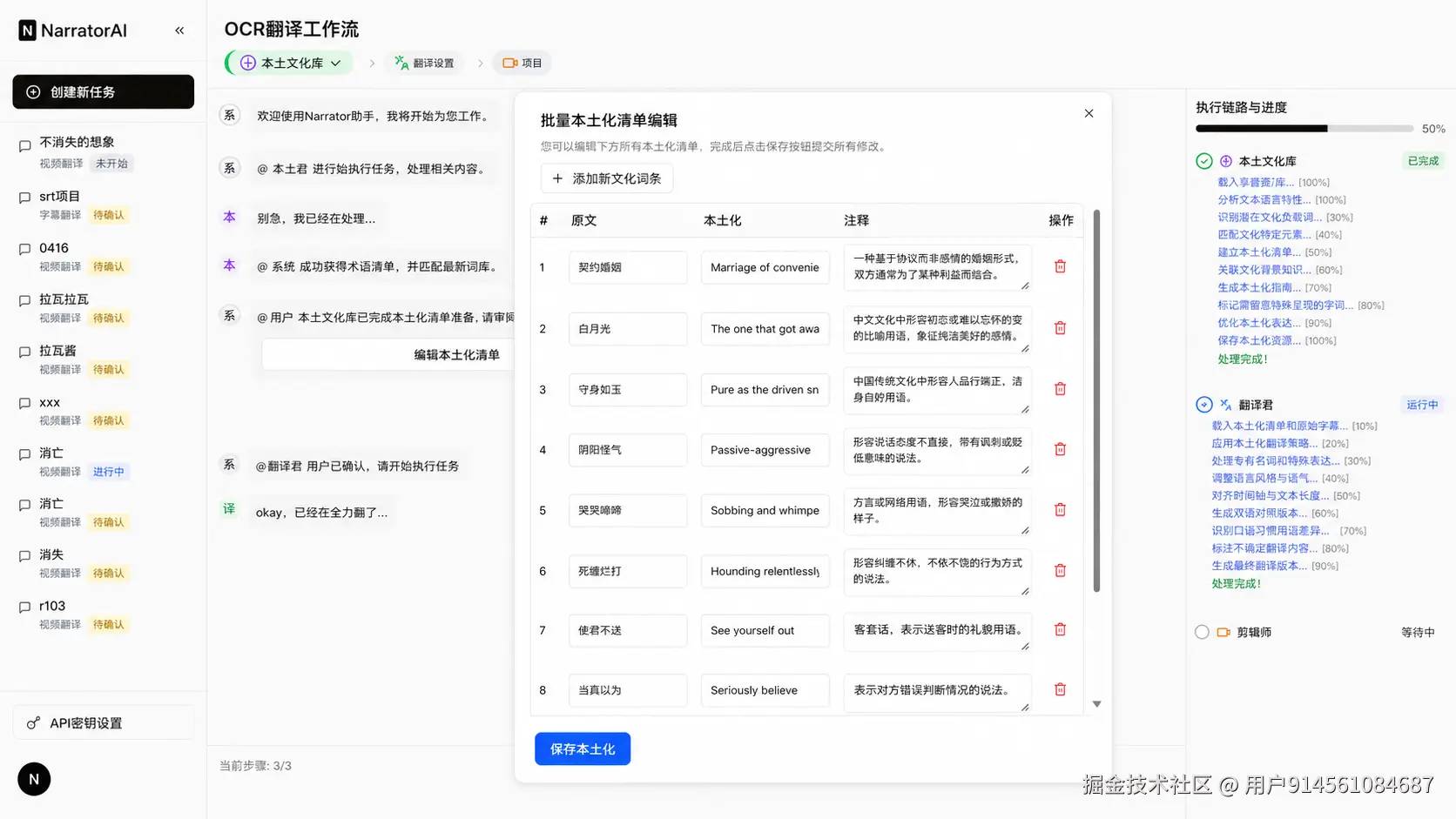 AI解说大师在翻译之前会先跑一个「本土文化君」Agent,自动扫描字幕里所有需要文化适配的表达——专有名词、网络梗、成语、情感隐喻——生成一份本土化清单,列出建议的映射关系。