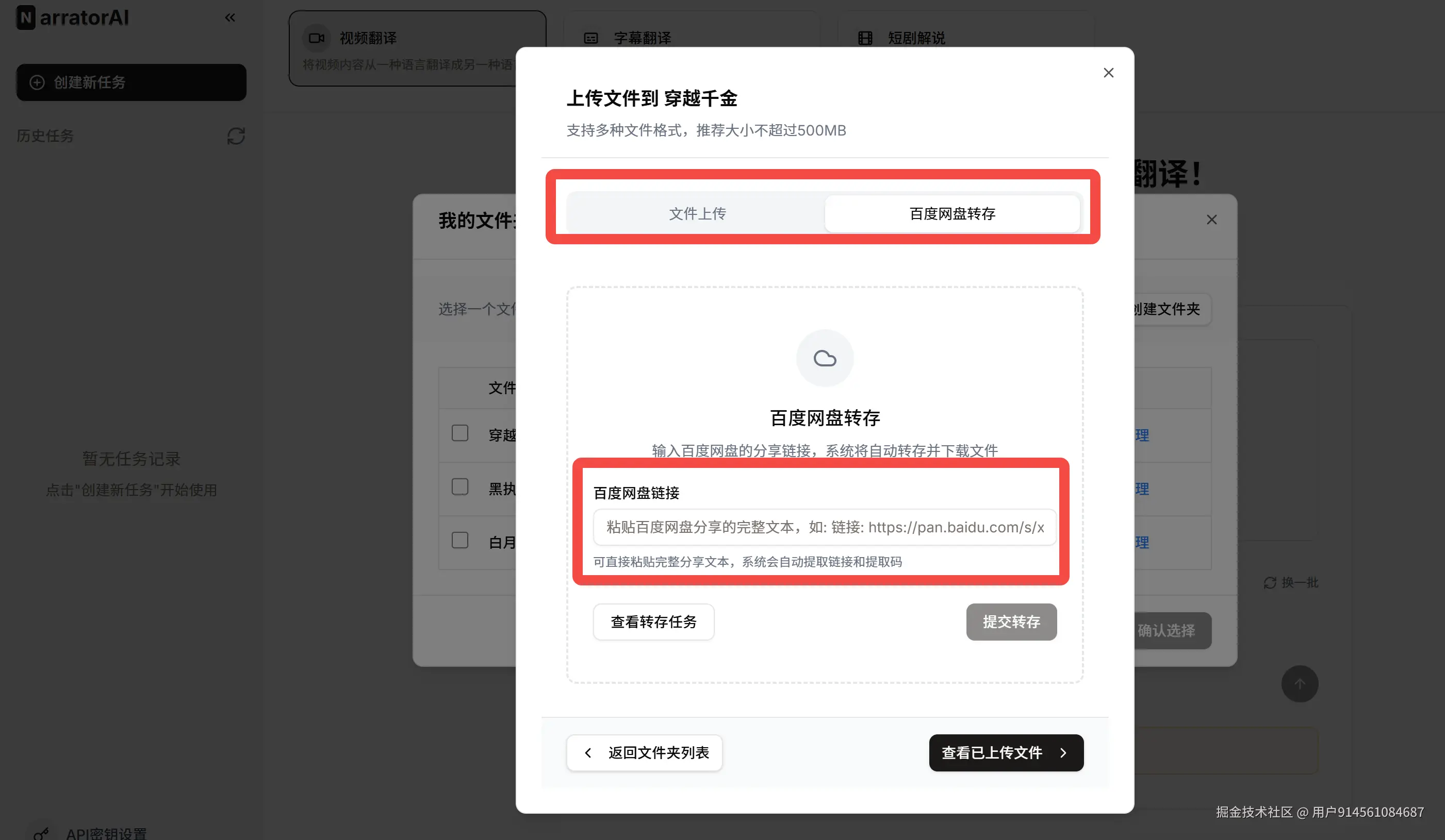 如果视频文件存在百度网盘,更省事:直接粘贴分享链接,系统自动提取并转存,不需要先下载到本地再上传。100集的网盘链接粘进去,系统自己去取,你去干别的事。
