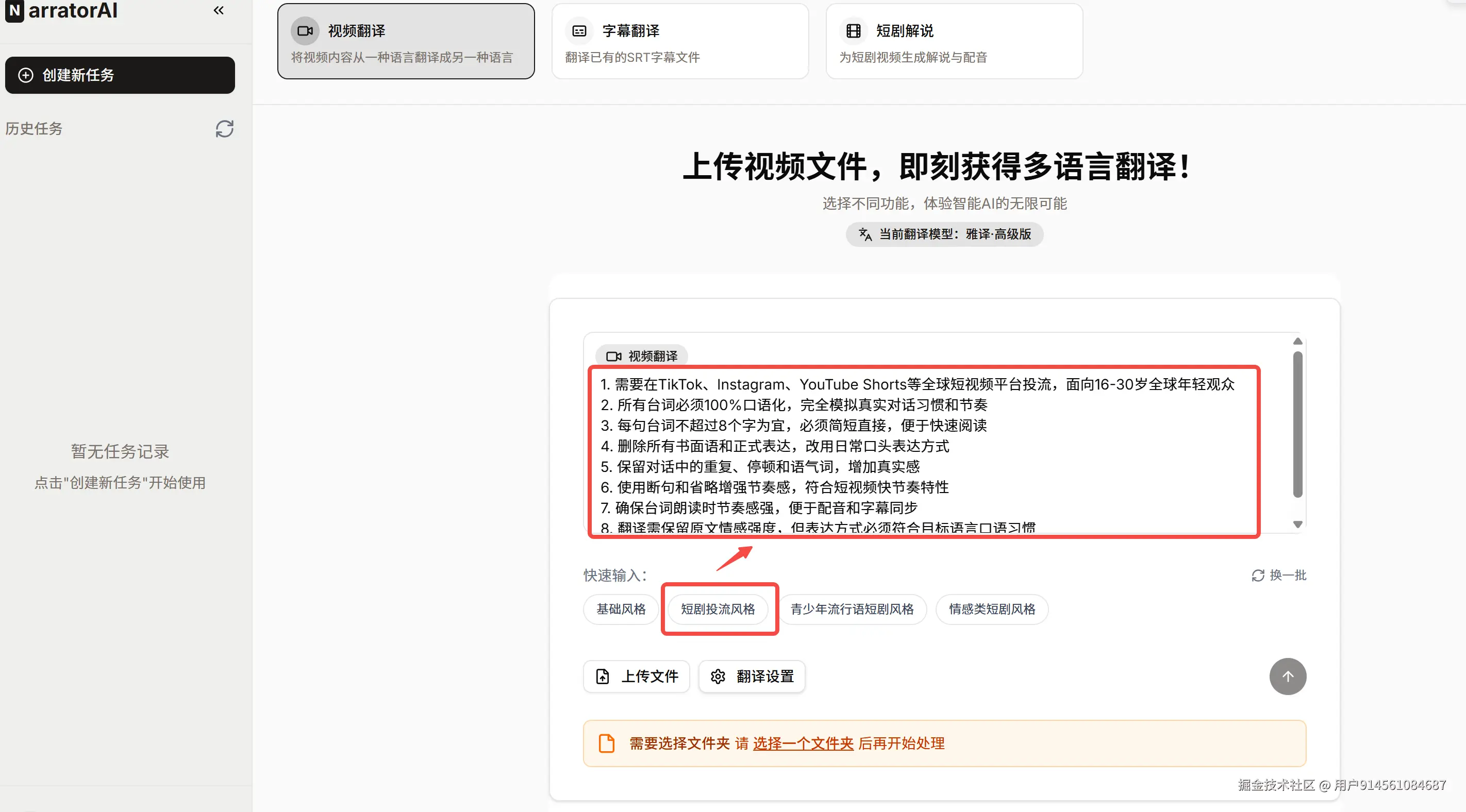 AI解说大师的翻译设置面板里有风格模板选项,针对不同投放平台和内容类型预设了不同的翻译调性: