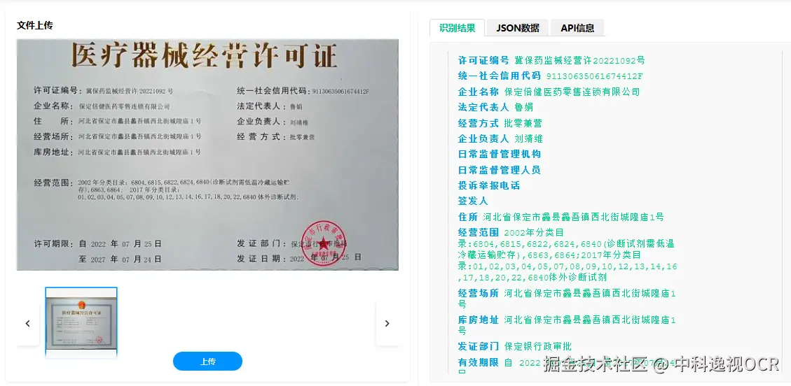 医疗器械经营许可证识别系统将非结构化的图像信息,秒级转换为JSON/XML 格式的结构化数据,可直接对接各类业务系统。同时内置合规校验规则库,自动核验许可证有效性: