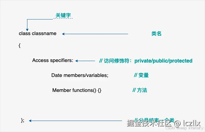 类的声明通常包括类名和它的成员列表,但不包括成员函数的实际代码。类声明的基本语法如下: