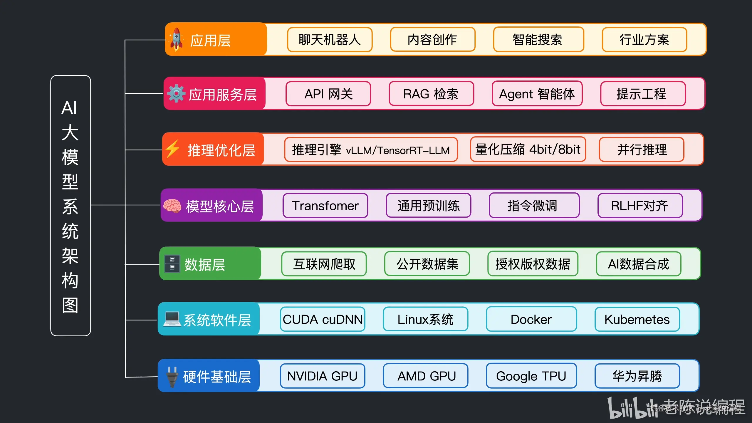 AI大模型:指的是具有大量参数的深度学习模型,经过大量数据训练,具备复杂计算能力的智能系统。核心架构有硬件层、软件层、数据层、模型层、推理层、应用服务层和应用层。