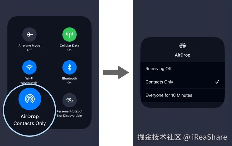 在 iPad 上,从右上角向下滑动打开控制中心,确保“隔空投送”已开启。然后将其设置为“仅限联系人”或“所有人,持续 10 分钟”。