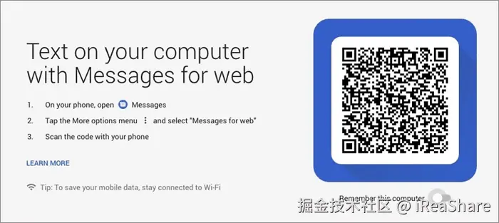 Google 信息支持 SMS、MMS、RCS 聊天,通过网页版可在 Mac 上查看和回复安卓短信。优点:免费;缺点:可能产生运营商短信费、仅支持短信、扫码偶尔连接失败。