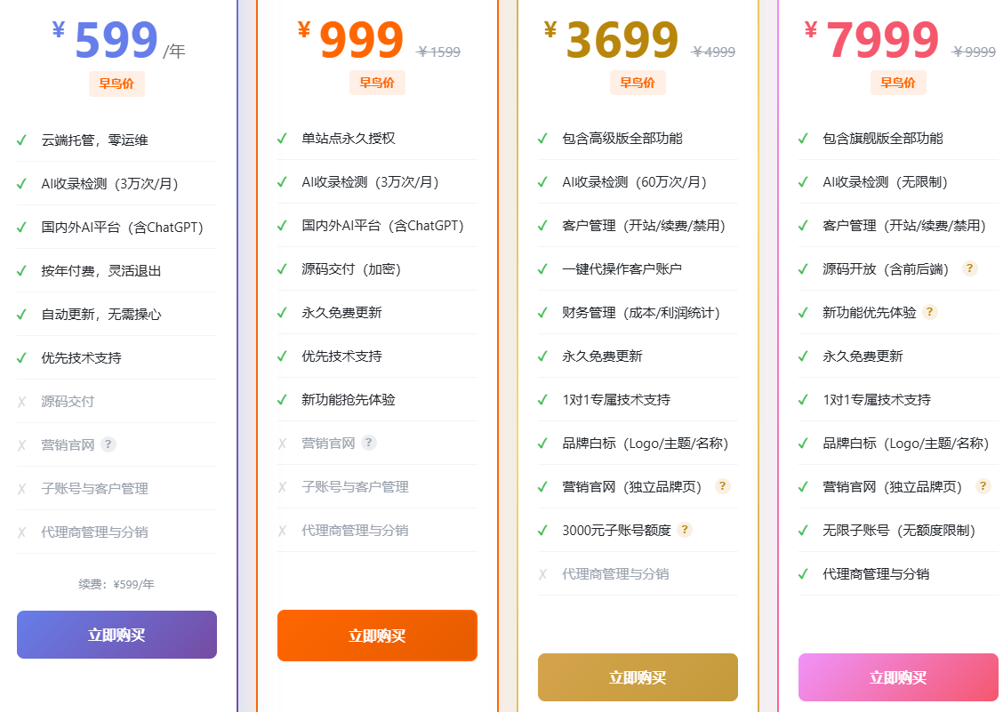 - 一次购买,永久使用 / 低年费,功能不限、次数不限,客户越多赚越多,长期成本极低。