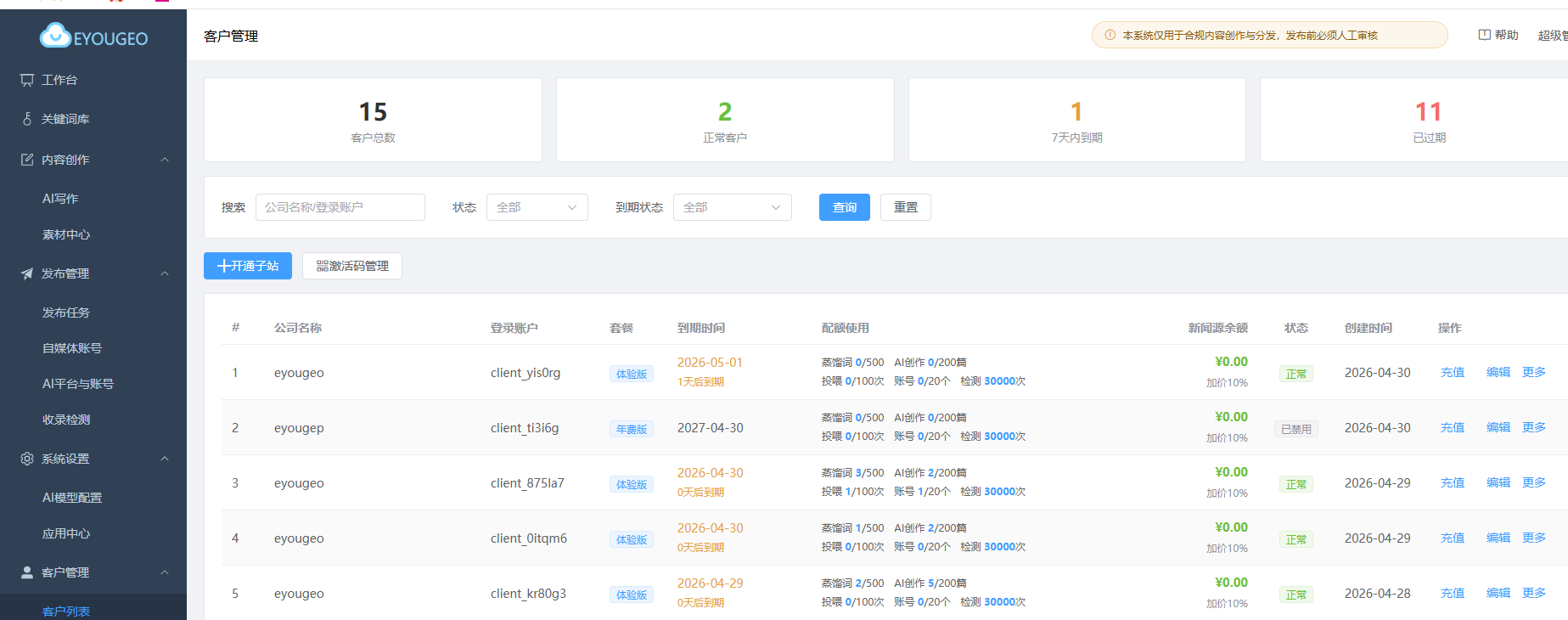 - 支持子账号、客户管理、代运营