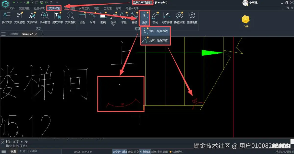选择实体:直接点击图纸中的两条线段,标注其夹角(如楼梯线段120°)。