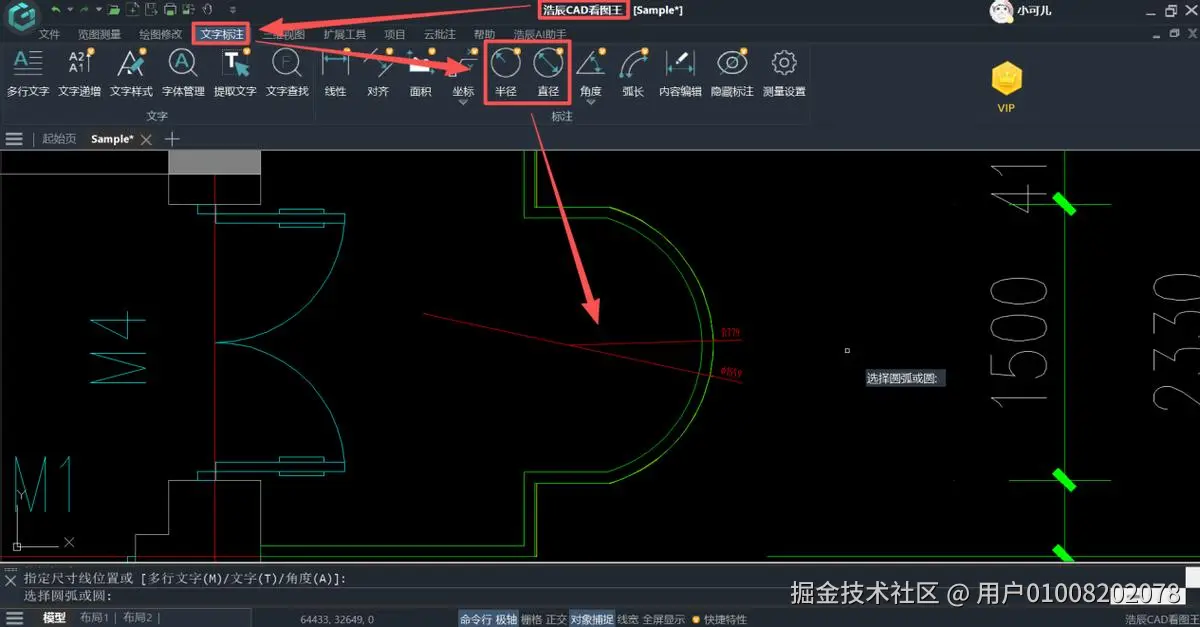 半径/直径标注:点击圆或圆弧,自动显示半径/直径数值。