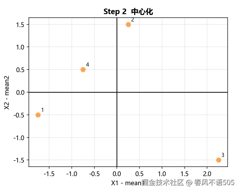 步骤 ①:去均值(中心化)。计算各维度的均值,并将所有数据减去均值: