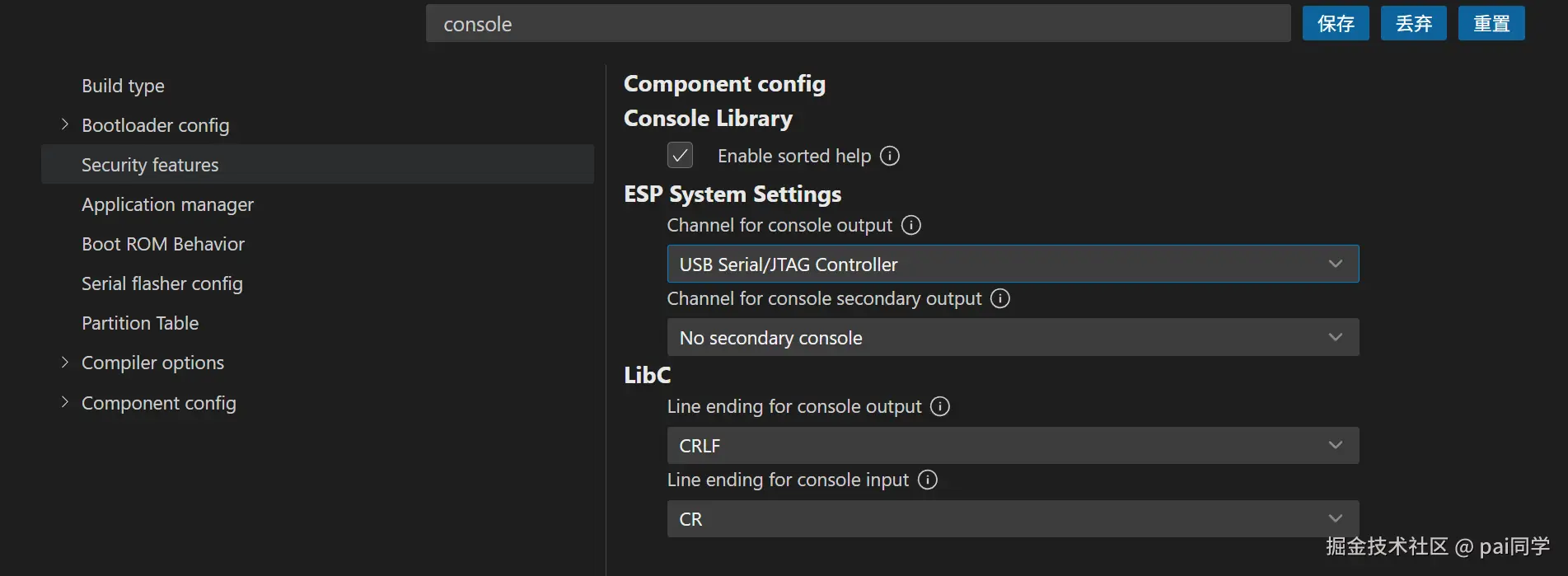 初始化 REPL 环境一体化函数共有三个,分别是通过UART、USB CDC、USB-SERIAL-JTAG来建立一个控制台REPL环境。在SDK配置编辑器——console设置中需要确定**Channel for console output**,从而确定初始化什么环境,这样就比较麻烦。