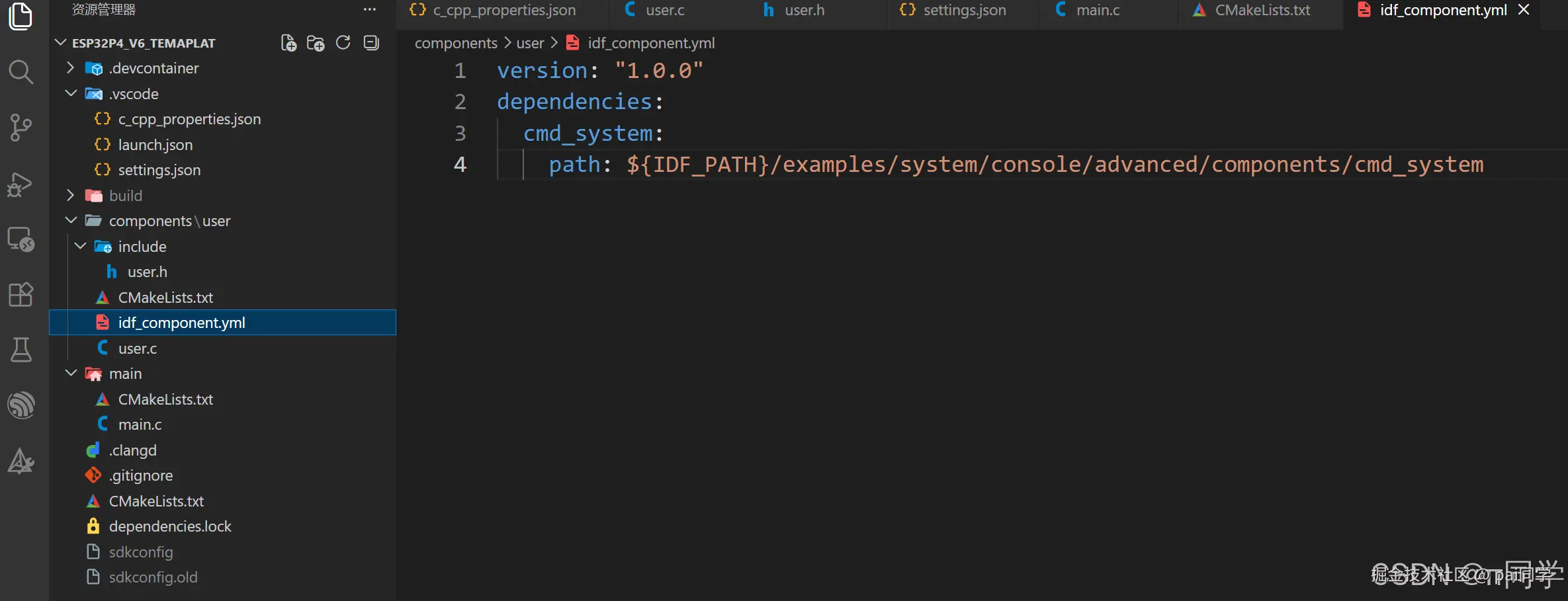 添加一个自定义组件,比如我这是user,接着在user文件夹下新建管理文件idf_component.yml,并在该文件中添加以下内容,显示效果如下。