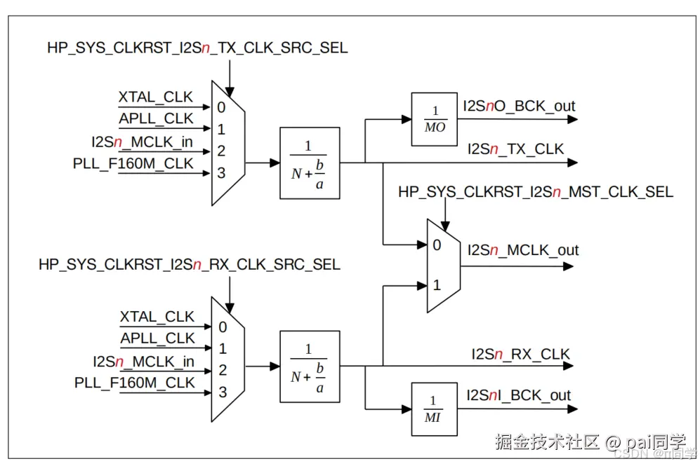 I2S时钟源来源有4个,其中可配置为APLL_CLK,最大支持到125M。主时钟频率MCLK由时钟源分频而来,N的范围为[2, 256],一般不使用分数b/a。位时钟频率可由MCLK分频而来。这些值具体如何设置见下一篇。