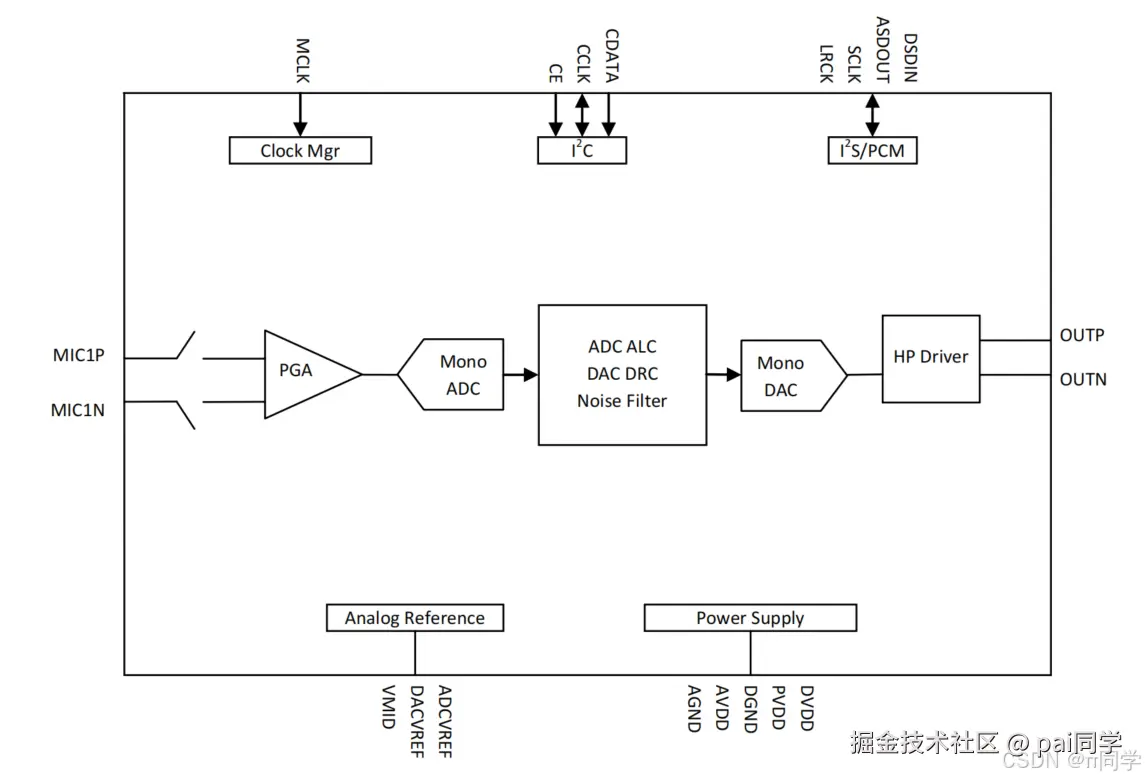 MIC1P、MIC1N是差分模拟音频输入,接收模拟麦克风采集的原始模拟声音电压。差分接法天生抗干扰,音质远超单端接法。