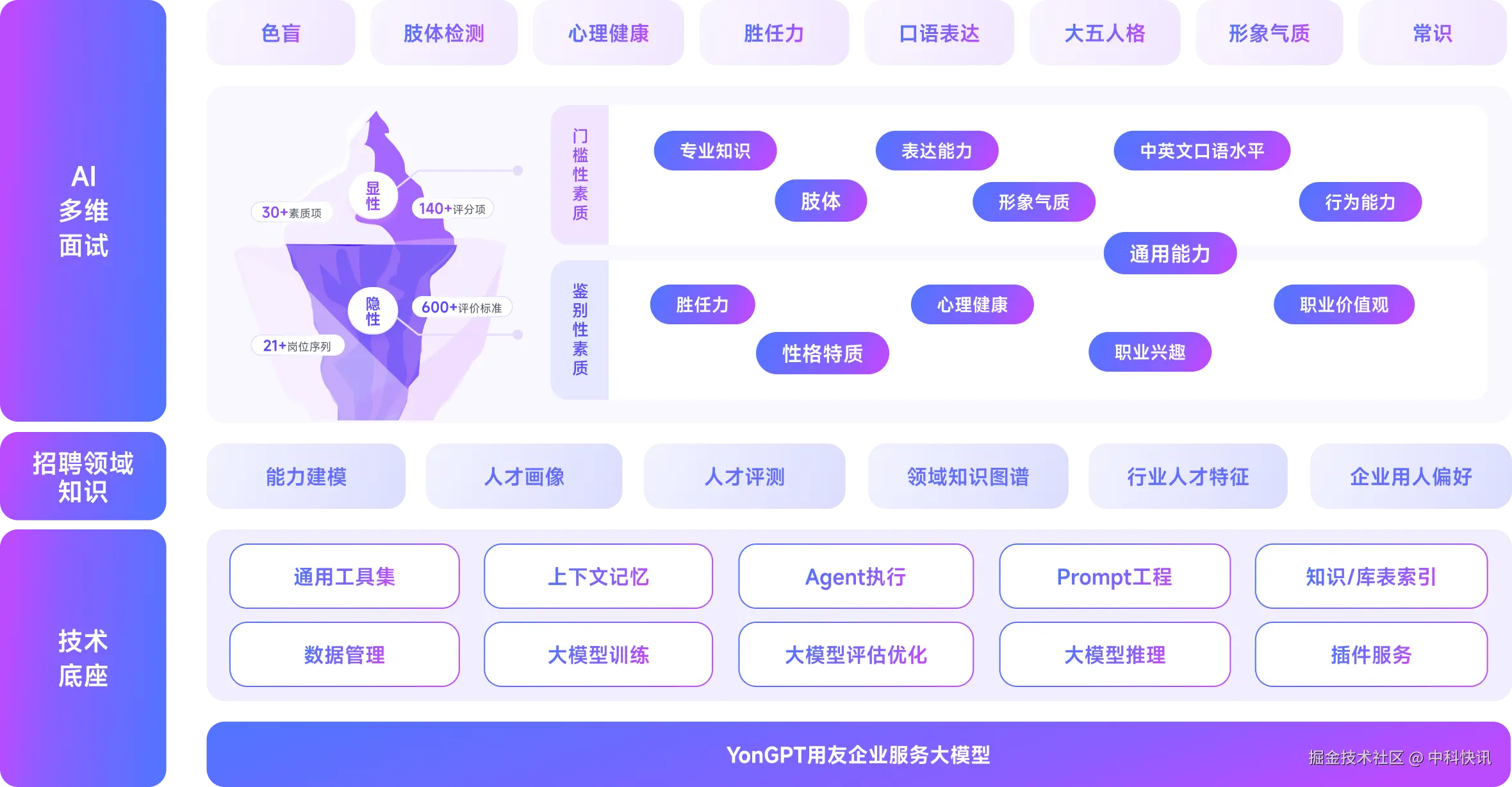 用友大易是用友集团旗下的核心HR SaaS品牌,在招聘领域深耕了18年,属于那种“平时不刷存在感,用起来才知道香”的类型。其AI面试产品依托自研的YonGPT企业级大模型,拿下了综合实力榜首的位置。它在HR圈子里口碑最集中的一点是“面得准”,这不是营销话术,背后有三大实打实的支撑: